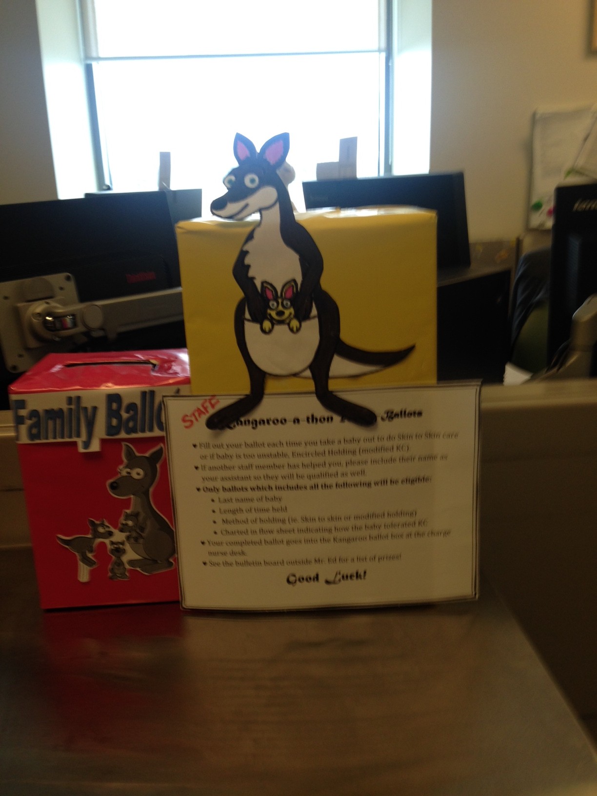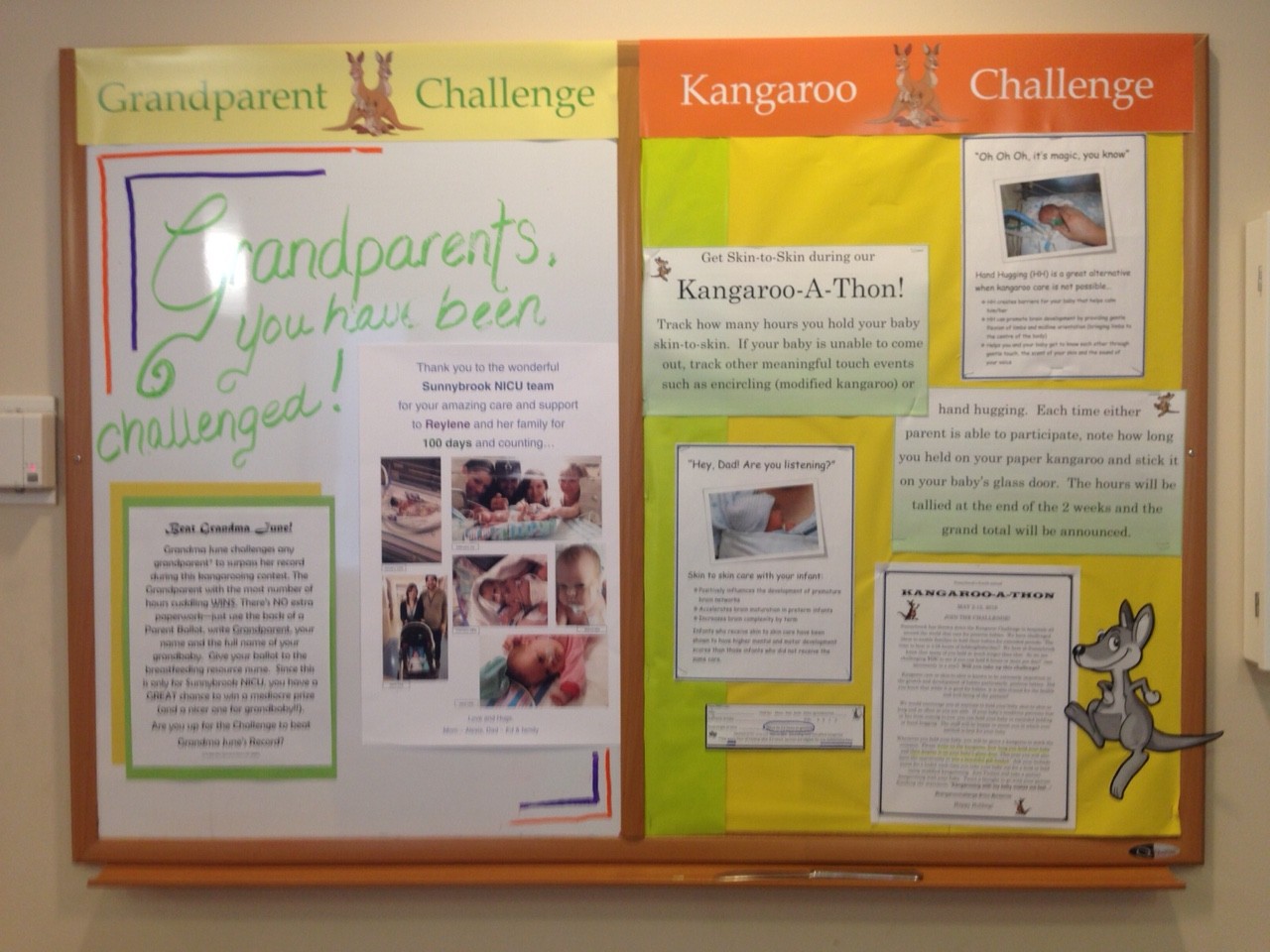Our Sunnybrook Kangaroo-a-thon launched today with a big party and a whole lot of cuddling. A dedicated volunteer crocheter made kangaroos for each and every family in our unit, and one of our breastfeeding resource nurses contributed the kangaroo cookies. We decorated the whole unit, made kangaroo colouring books for siblings, and are creating a whole “Thank You” wall for our wonderful staff members. So much fun!
