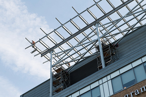 The steel frame rises: Construction of the structural steel frame was a key part of the building process, providing support for the helipad high above the hospital’s main wing.